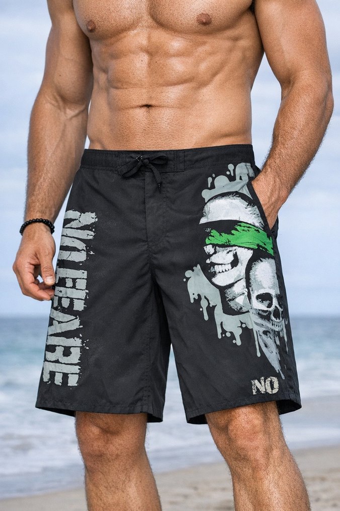 Siyah renkli, baskılı ve bel kemerli erkek mini şort. Gevşek kesimi ve kısa boyu ile plajda rahat kullanım sağlar.