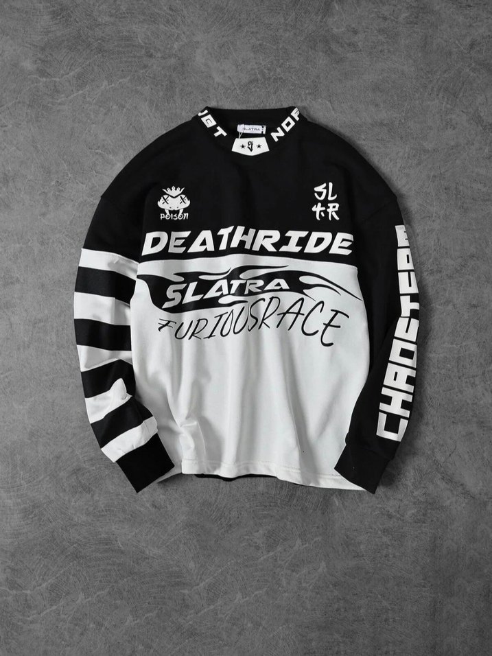 Uzun kollu, bisiklet yaka, bol kesim erkek sweatshirt. Yumuşak ve sıcak dokuma kumaştan, siyah beyaz baskılı, sokak stilinde ve rock punk tarzında. Günlük kullanım için uygundur.