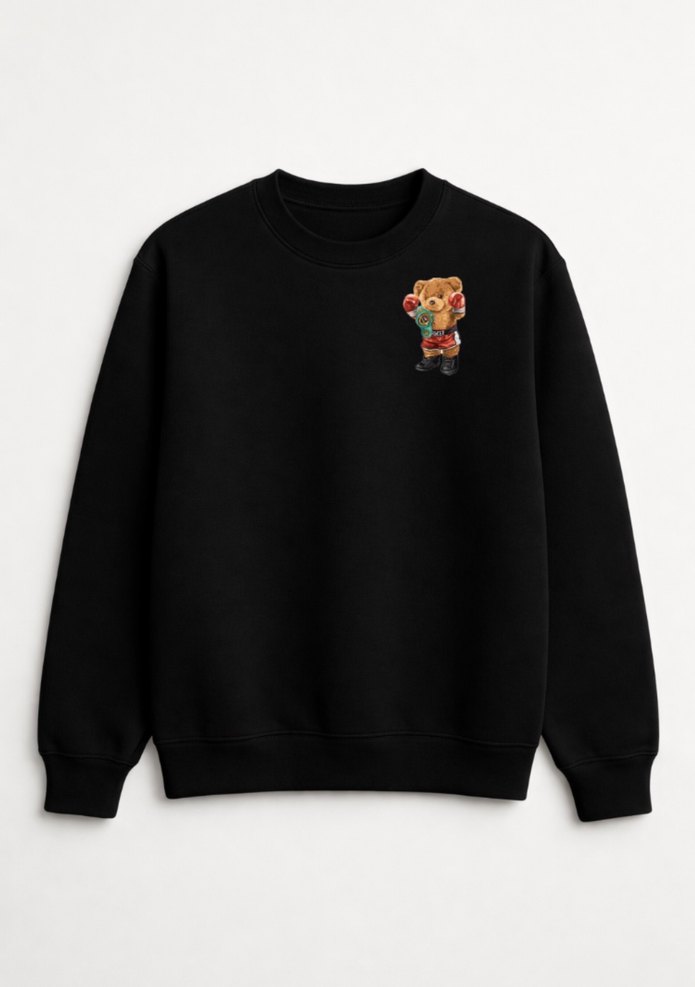 Uzun kollu, bisiklet yaka siyah erkek sweatshirt, baskılı ayıcık deseni ile. Rahat kesim, yumuşak ve sıcak kumaş, günlük kullanım için uygun. HER BEDENİ MEVCUTTUR