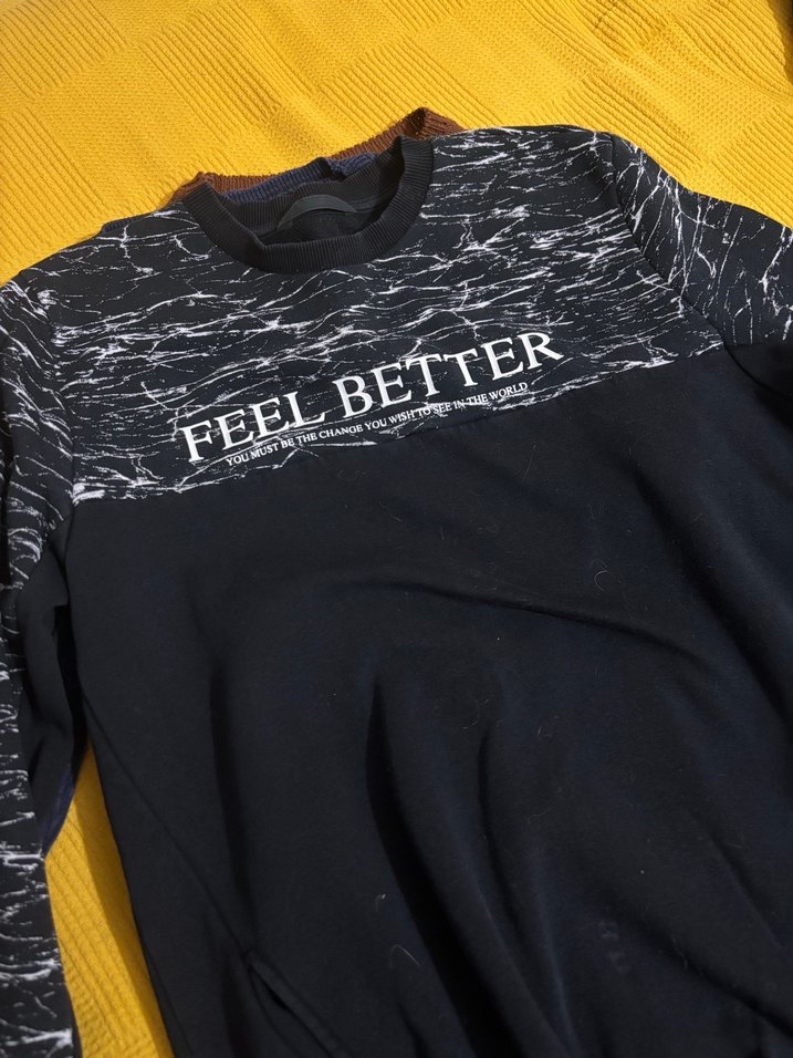 Siyah, baskılı ve örme dokulu erkek sweatshirtü, uzun kollu ve bisiklet yaka. Rahat kesimi ve "FEEL BETTER" yazısı ile günlük kullanıma uygun.