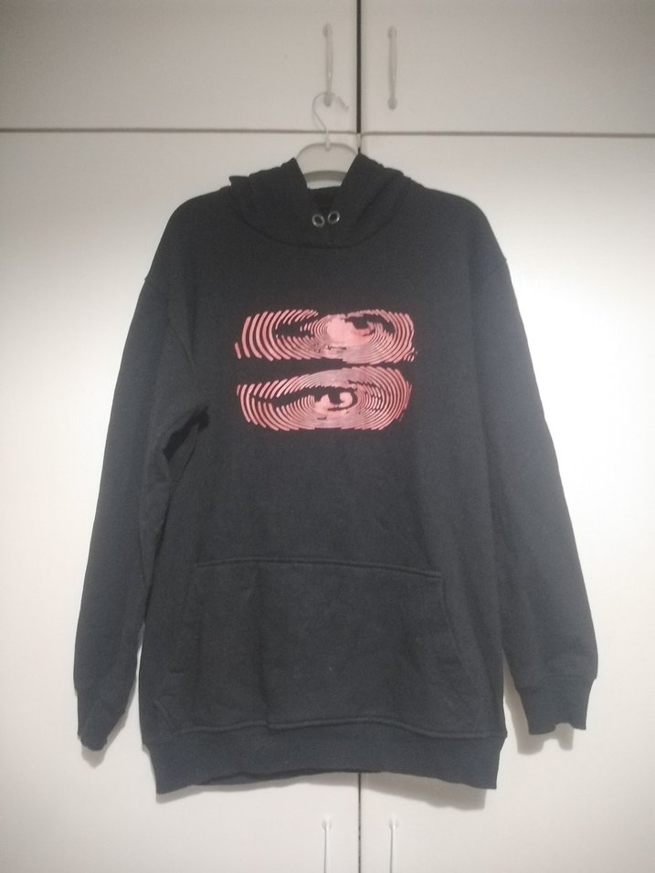 Siyah renkli erkek sweatshirt, bisiklet yaka ve uzun kolludur. Baskılı deseni ve yırtmaç detayı vardır. Rahat kesimiyle midi boyda, ön cepli, yumuşak ve sıcak kumaştan üretilmiştir.