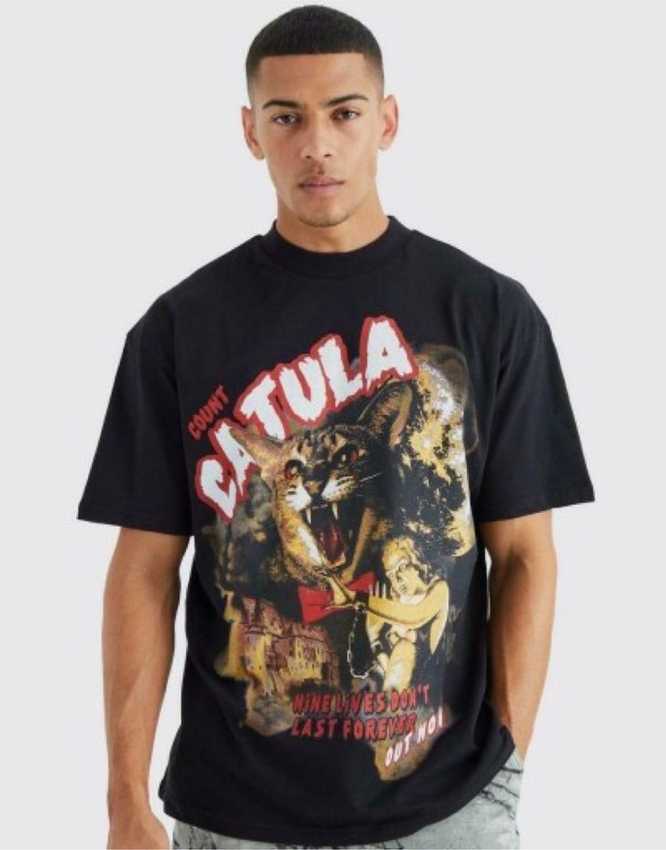 Siyah baskılı, kısa kollu, yuvarlak yakalı, bol kesim erkek T-shirt. Sentetik kumaştan, günlük kullanıma uygun. BoohooMAN marka
