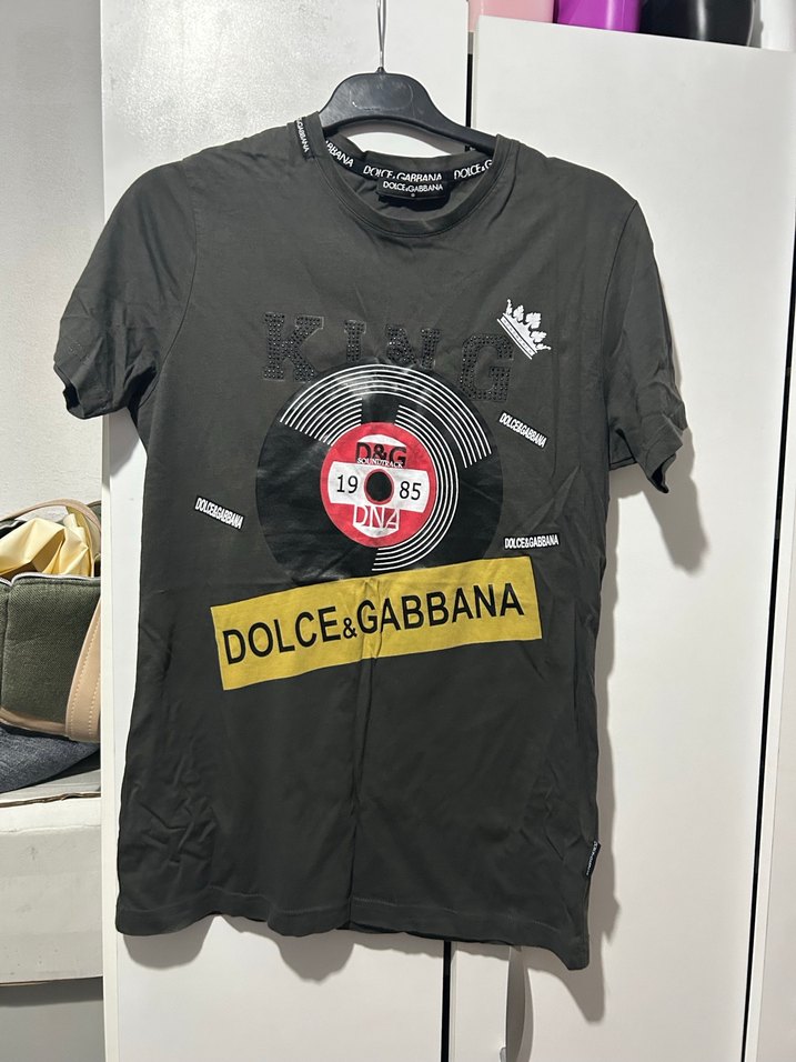 Siyah, kısa kollu, bol kesim erkek tişörtü. Yuvarlak yaka ve Dolce&Gabbana baskılı, sokak modası ve rock punk tarzı yansıtıyor.
