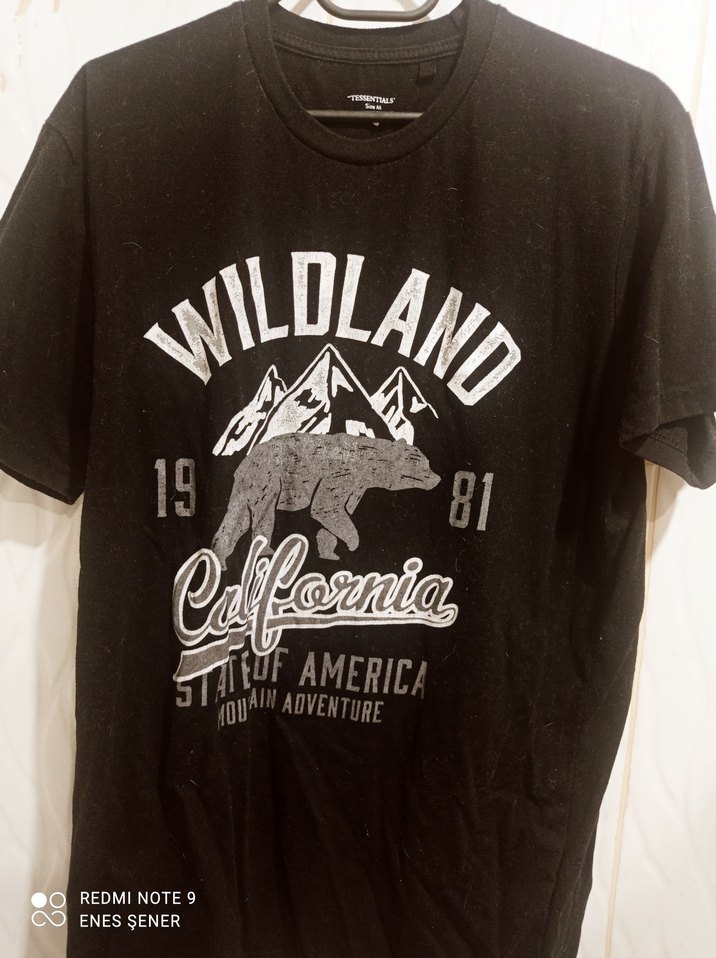 Siyah pamuklu erkek tişörtü, kısa kollu, yuvarlak yakalı ve bol kesimdir. Üzerinde ayı, dağlar ve California yazılı baskı vardır.