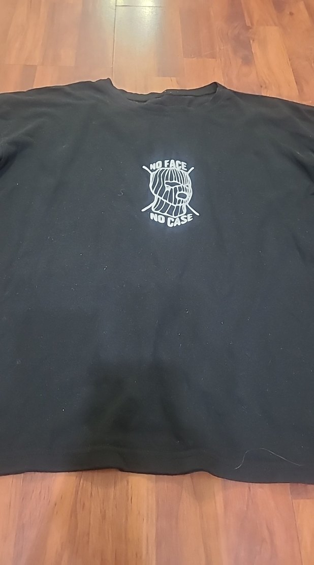 Siyah baskılı erkek tişört, kısa kollu, yuvarlak yaka ve bol kesimdir. Yumuşak, sıcak kumaştan yapılmıştır ve grunge punk tarzı baskıya sahiptir.