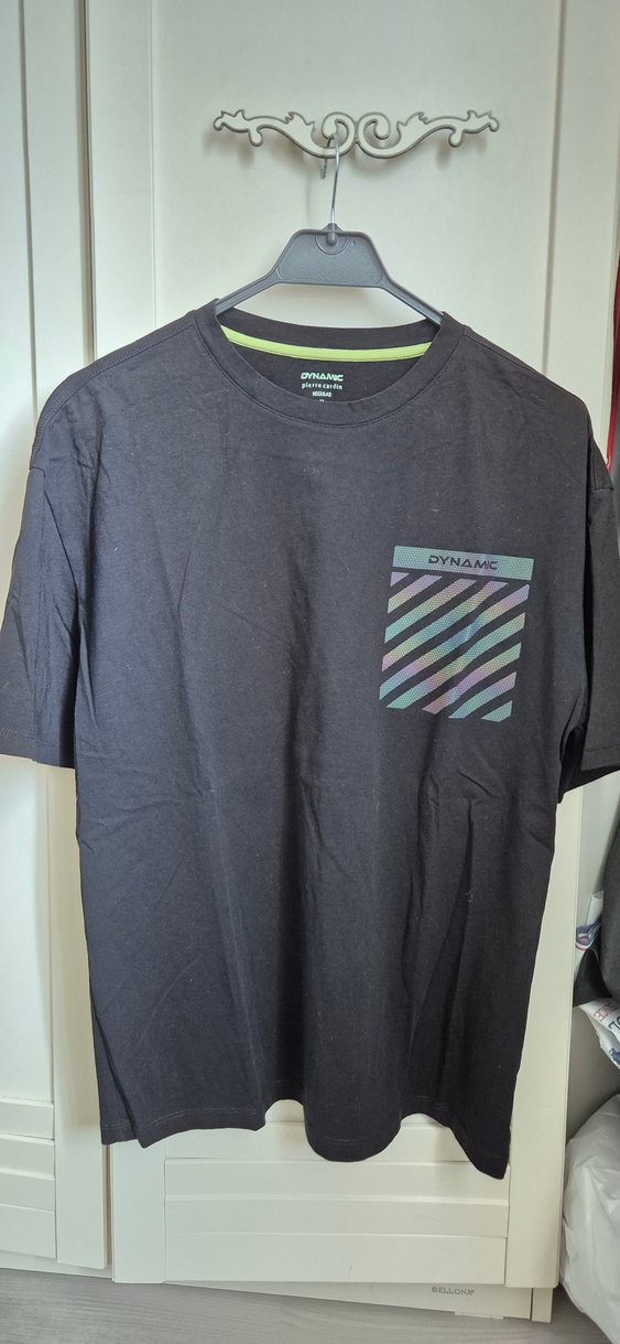 Siyah, baskılı cep detaylı, kısa kollu, yuvarlak yaka, bol kesim erkek tişörtü. Pürüzsüz sentetik kumaştan, rahat sokak stiline uygun.