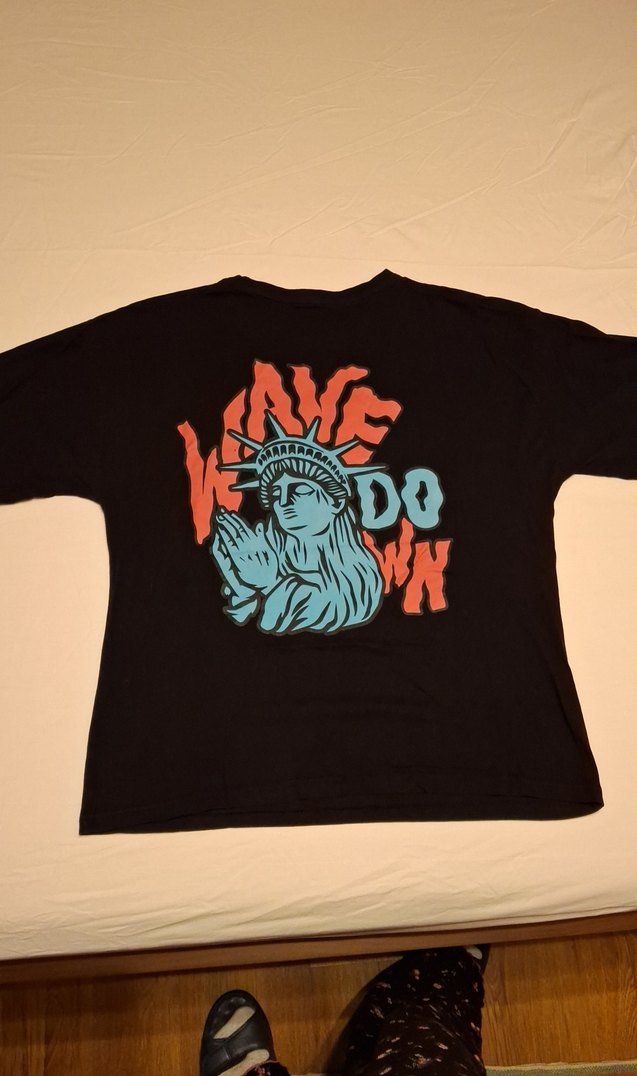 Siyah baskılı, kısa kollu erkek tişörtü, Velcro detaylı, bol kesim ve bisiklet yaka ile casual sokak tarzı için uygun. renginde solma yoktur
