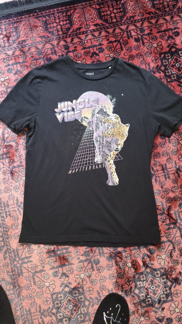 Siyah, kısa kollu, salaş kesim erkek tişörtü. Önünde jungle temalı baskı var.