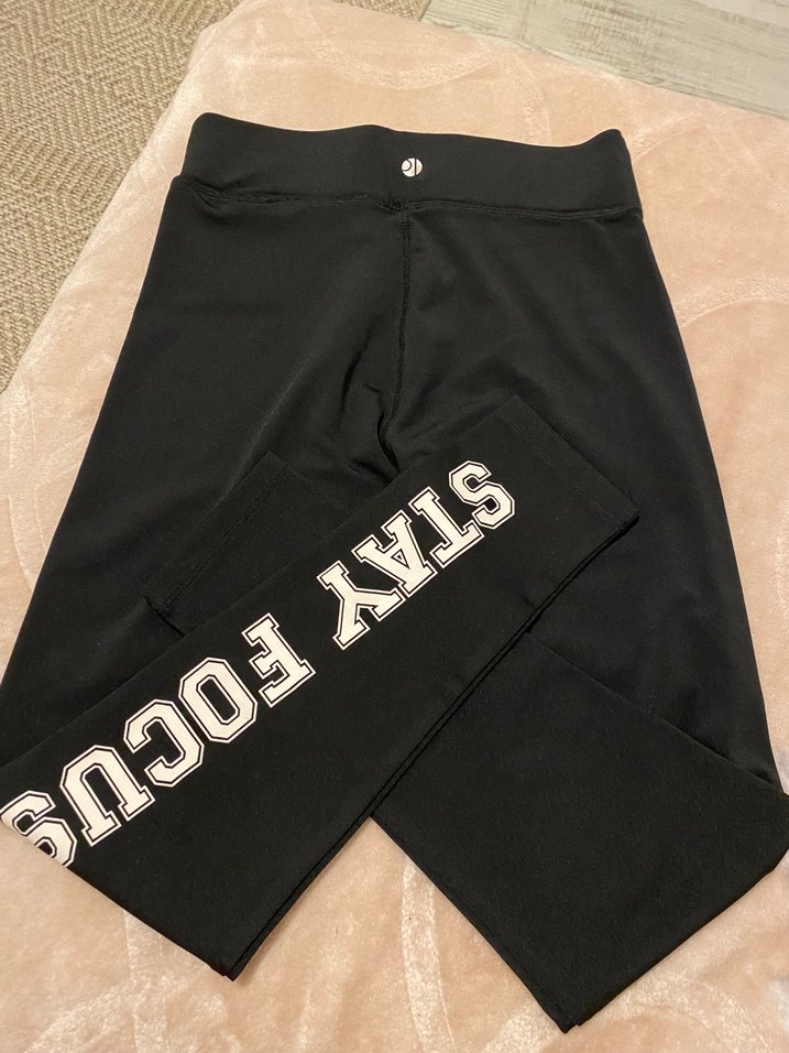 Siyah, esnek beli ve bacakta büyük baskılı yazısı olan kadın taytı, pürüzsüz sentetik kumaştan üretilmiştir hiç giyilmedi.