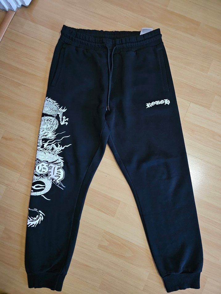 Siyah renkli, baskılı tasarıma sahip, bol kesim eşofman altı. Fermuarlı cepler ve bağcıklı bel detayları bulunur.