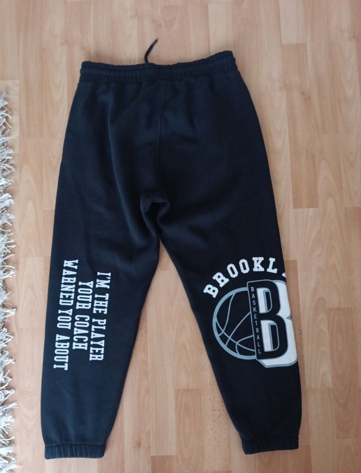 Yumuşak kumaştan, kemerli ve baskılı yazı ile siyah bol kesim eşofman altı. Spor ve rahat stil için uygundur.