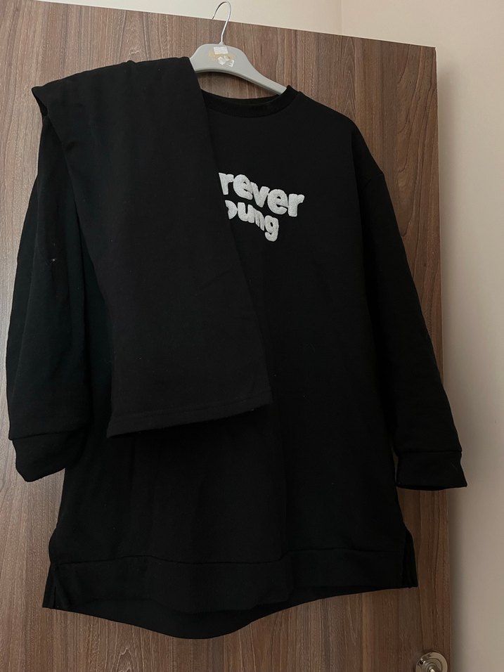 Siyah, baskılı, uzun kollu, oversize kesim ve bisiklet yaka kadın sweatshirt, yumuşak ve sıcak kumaştan yapılmıştır.