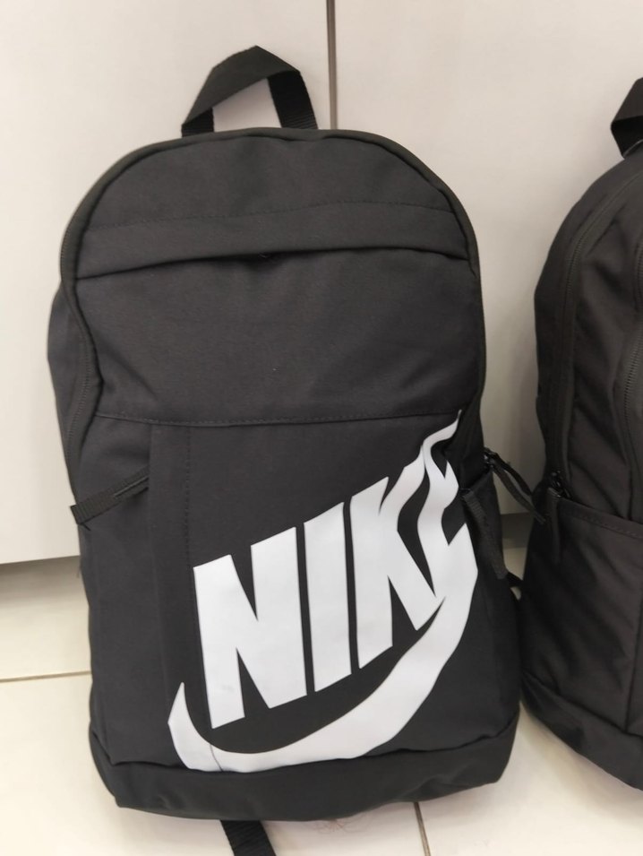 Siyah renkli, baskılı NIKE logosu ve fermuarlı bölmeleri olan erkek sırt çantası, streetwear ve athleisure tarzlarına uygun.