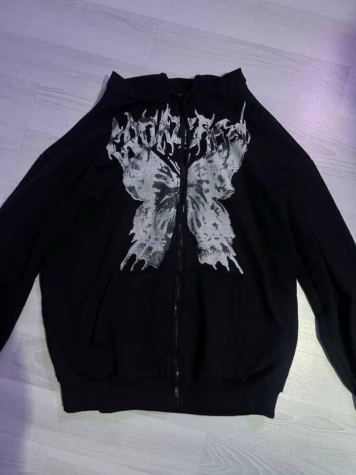 Uzun kollu, fermuarlı ve baskılı gotik desenli siyah sweatshirt. Yumuşak sentetik kumaştan, rahat ve günlük kullanım için uygun.