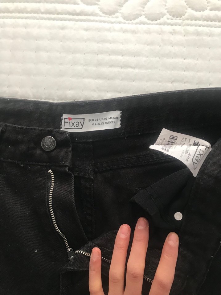 Fermuarlı ve baskılı detaylara sahip, siyah renkli, normal boyda, dar kesim kadın kot pantolon. Günlük ve sokak stili için uygundur. Marka: Fixay. Bedenleriyle gösterildi tekli fiyat 120 TL