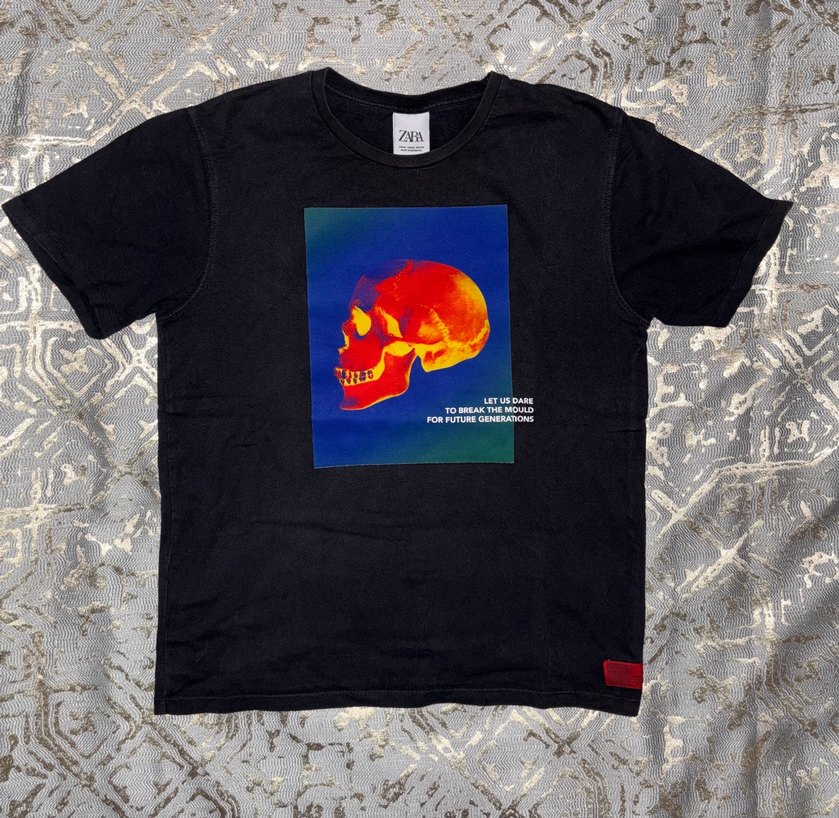 Önü canlı baskılı kafatası desenli siyah erkek tişörtü. Yuvarlak yaka, kısa kollu ve gevşek kesim, grunge punk tarzına uygun.