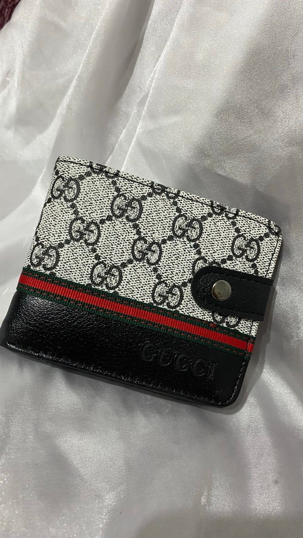 Baskılı Gucci logosu, siyah deri bölümü ve çıtçıtlı kapanışı olan erkek cüzdanı, Paris sokak modası tarzını yansıtıyor.
