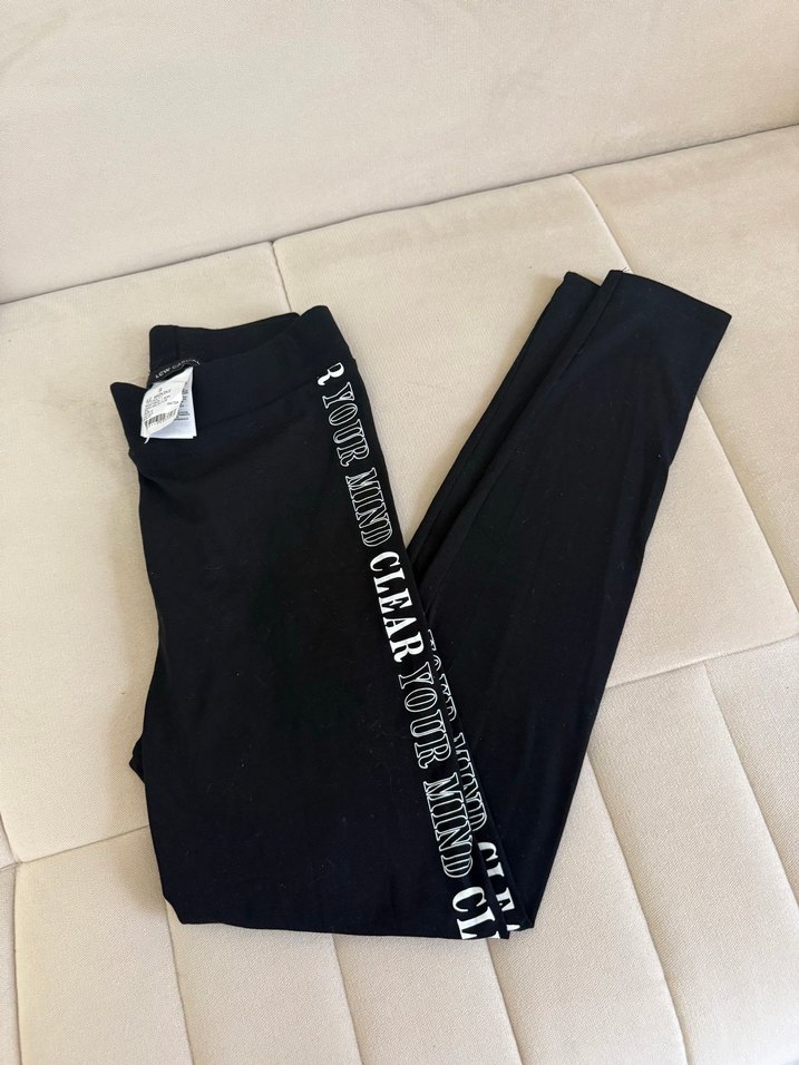 Baskılı detaylı, elastik bel bantlı siyah tayt, günlük kullanıma uygun koyu renk rahat kumaştan. Hiç kullanılmadı