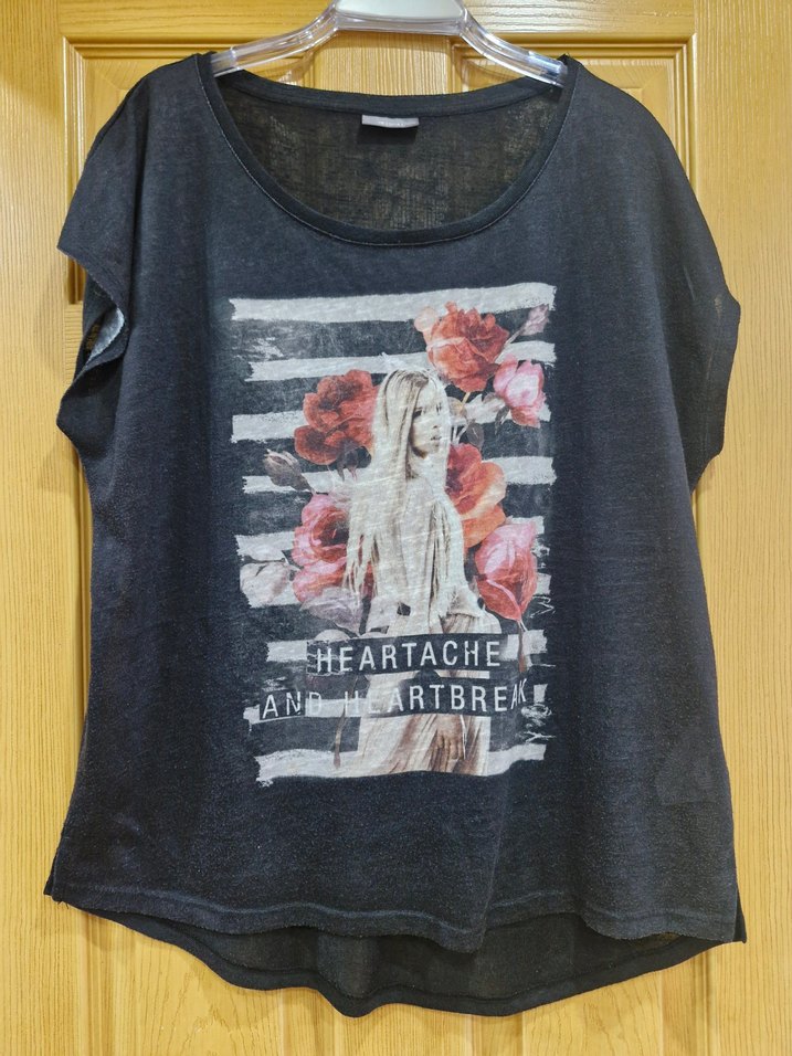 Siyah zemin üzerinde çiçekli ve kısa kollu, yuvarlak yaka, bol kesim tişört. L bedendir 40 42 beden uyumludur. Günlük rahat kullanım için uygundur.