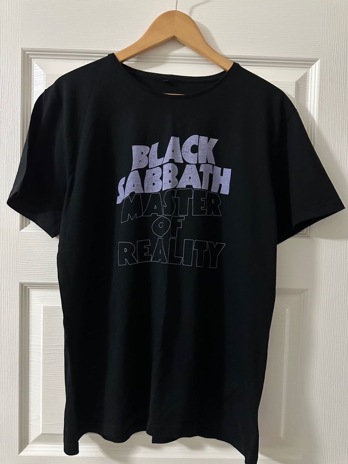 Siyah, kısa kollu hamile tişörtü, bol kesim ve ipeksi dokuda. Üzerinde Black Sabbath baskısı bulunur, gotik parti havası için uygun.