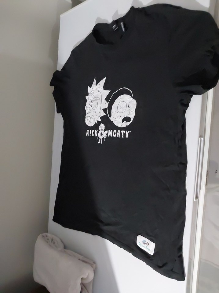 Pamuk kumaştan, kısa kollu ve bol kesim siyah hamile tişörtü. Rick ve Morty baskılı, günlük kullanıma uygun.