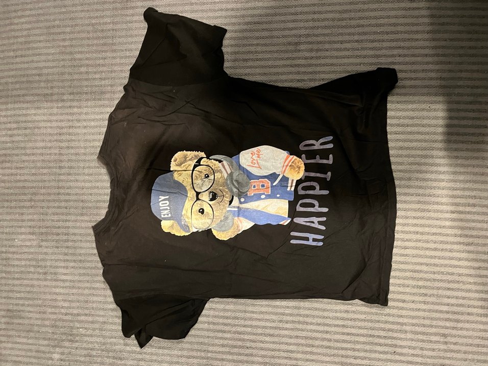 Siyah, baskılı ayıcık desenli, kısa kollu, yuvarlak yakalı, bol kesim hamile tişörtü. Yumuşak ve sıcak kumaştan, rahat günlük kullanım için uygun.