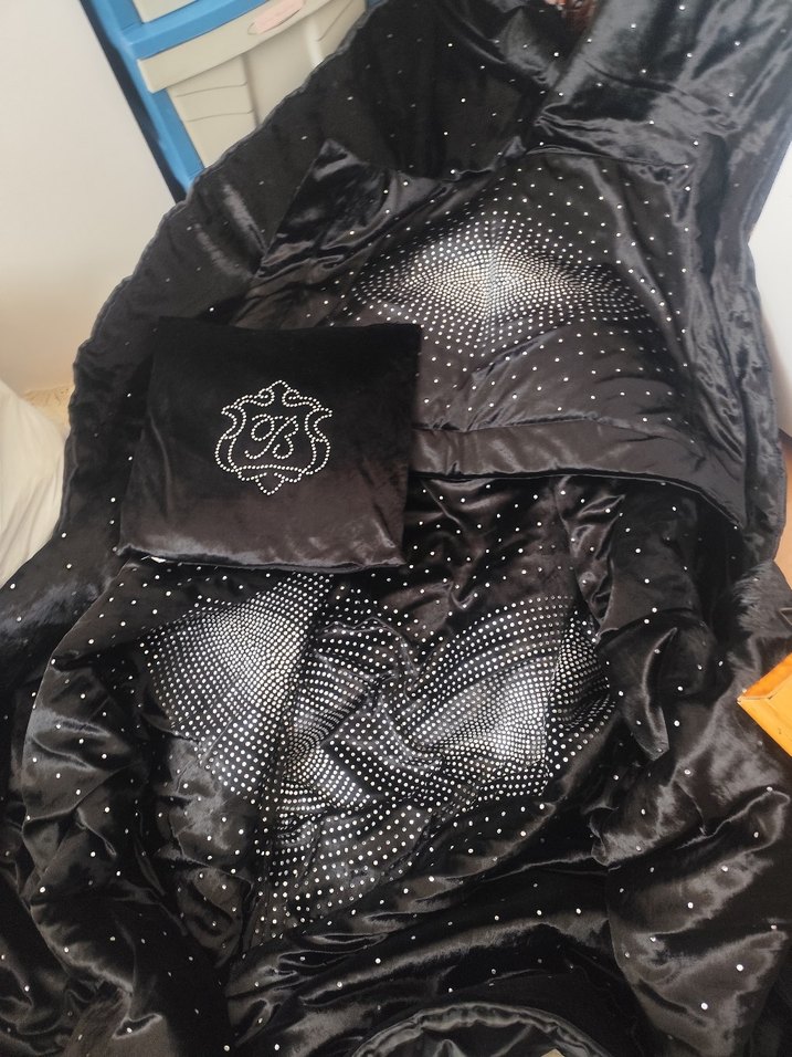 Siyah kadife kumaştan yapılmış, parlak baskılı desenli battaniye, şıklık ve sıcaklık sağlar. ✨