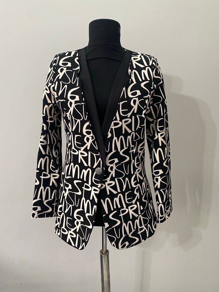 Siyah baskılı, düğmeli mini blazer. Çentikli yaka ve vücuda oturan bir kesimi var hiç giyilmedi