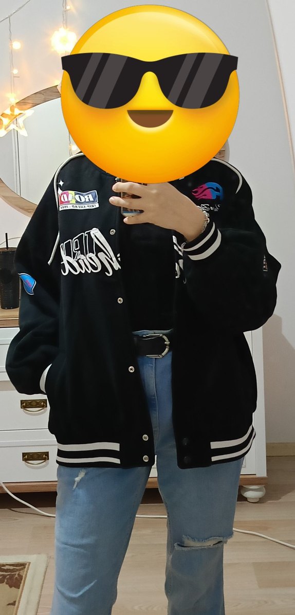 Siyah, baskılı, düğmeli ve uzun kollu kadın bomber ceket. Rahat kesimi ve yuvarlak yakasıyla sokak stiline uygun. Yumuşak ve sıcak kumaştan üretilmiştir.