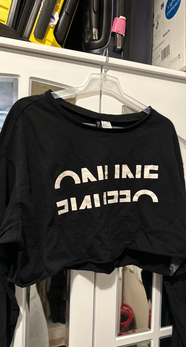 Siyah, uzun kollu, yuvarlak yakalı ve bol kesim kadın sweatshirt. Yumuşak pamuktan, parlak baskılı ve günlük rahat sokak stili için uygundur.