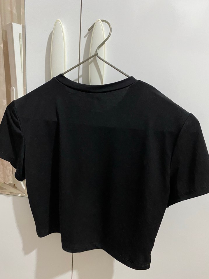 Siyah baskılı crop tişört, kısa kollu ve yuvarlak yaka. Pamuk kumaştan, bol kesim ve günlük rahat stil için uygun.