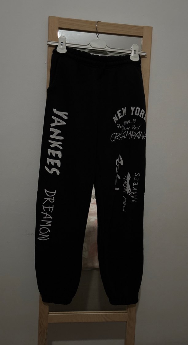 Baskılı sokak stili grafiklere sahip, rbol kesim siyah denim kadın sweatpant.