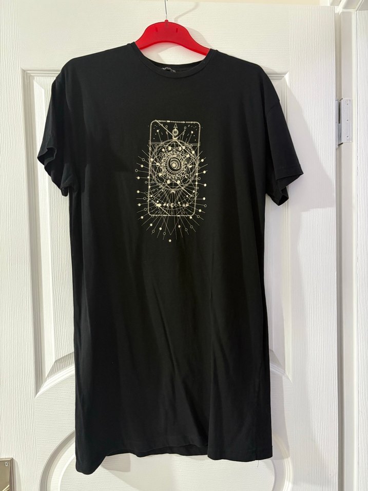 Siyah renkli, kısa kollu, yuvarlak yakalı ve baskılı gotik tasarımlı elbise. Penye kumaştan , bol kesim.