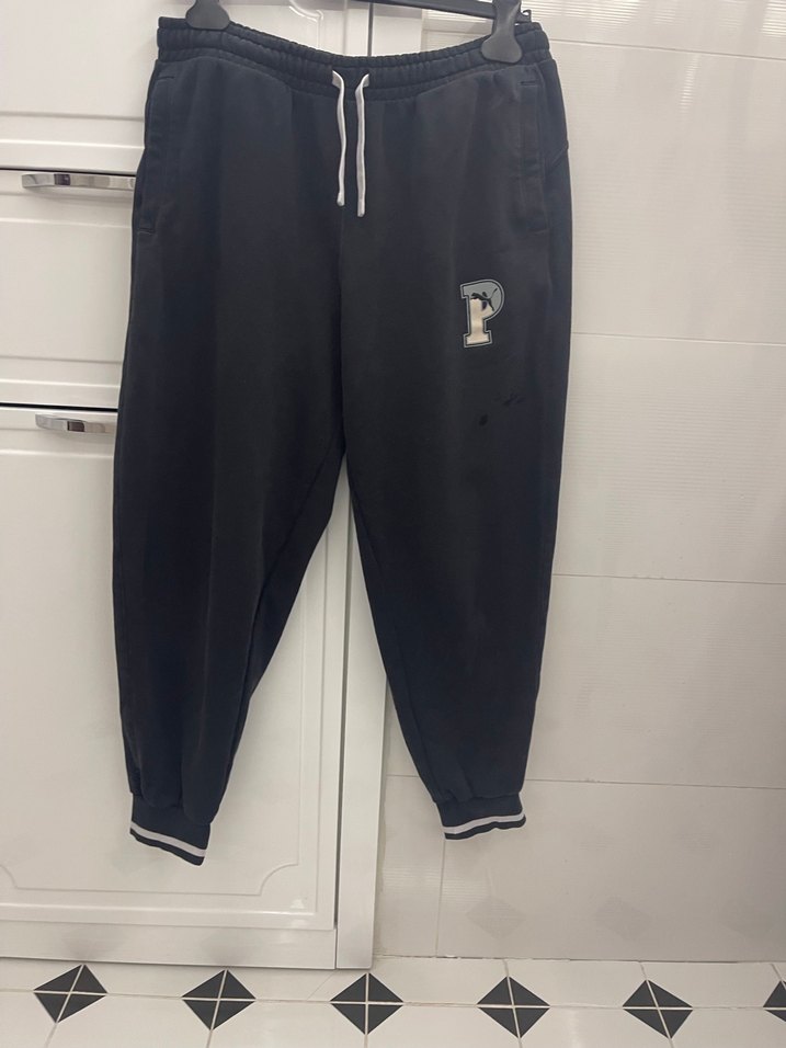 Siyah, bol kesim, baskılı kadın spor pantolonu. Kemerli bel ve ribanalı paçalar içerir, rahat ve spor kullanım için uygundur. Orijinal Puma, yumuşak kumaş koyu siyah