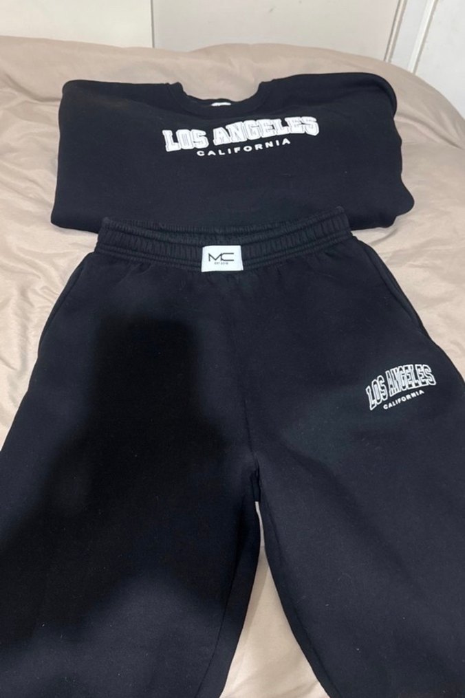 Siyah renkli, bol kesim ve normal boyda, sentetik kumaştan yapılmış, baskılı 'Los Angeles' yazılı kadın eşofman altı.