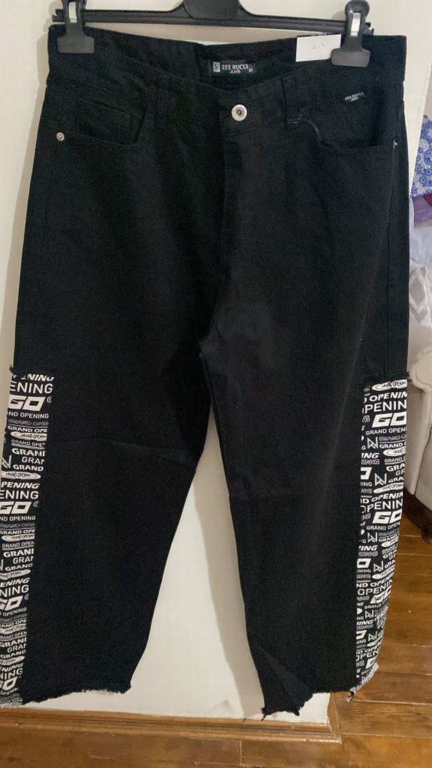 Siyah kot pantolon, yanlarda baskılı detaylar ve kemerli bel ile rahat ve salaş bir görünüm sunar.