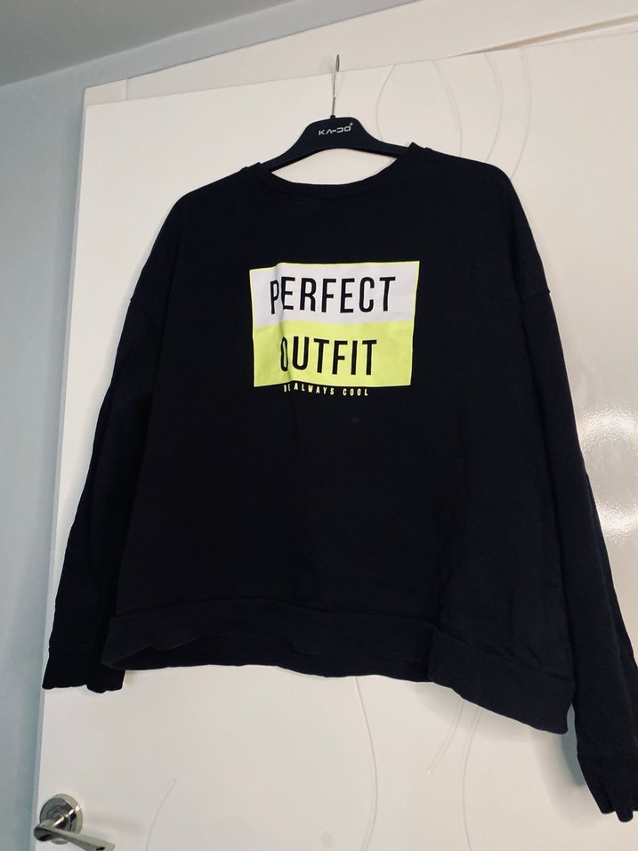 Siyah pamuklu, oversize kesim, uzun kollu ve bisiklet yaka sweatshirt. Örme dokusu ve "PERFECT OUTFIT" baskısı bulunur. Rahat sokak stili için uygundur.