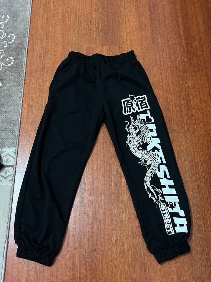 Baskılı ejderha ve yazı desenli, bel kemerli, lastikli paçalı siyah bol kesim kadın eşofman. Hiç giyilmemiştir.