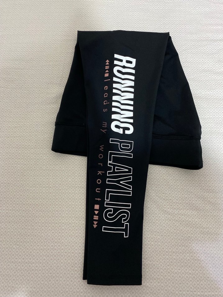 Spor tayt, kapri boy, M beden ancak S’ye uygun, ölçüsünü ekledim. Sorunsuz. Siyah, elastik sentetik kumaştan yapılmış, baskılı "RUNNING PLAYLIST" yazılı, spor ve günlük kullanıma uygun kadın taytı.