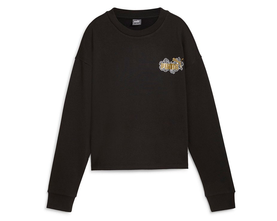 Siyah, uzun kollu, yuvarlak yakalı, bol kesim ve baskılı tasarıma sahip kadın sweatshirt. Orta uzunlukta, yumuşak ve sıcak kumaştan üretilmiştir.