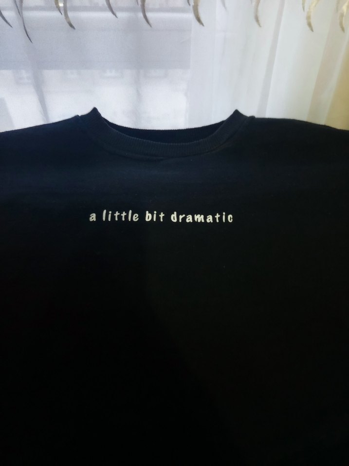 Siyah, uzun kollu, baskılı ve bol kesim kadın sweatshirtü. 'a little bit dramatic' yazılı, sentetik kumaştan, günlük kullanıma uygun goth athleisure tarzında.