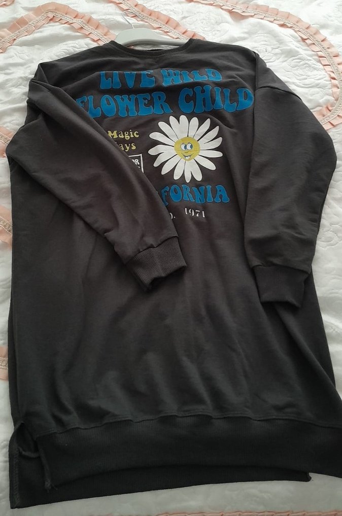Siyah, uzun kollu, bol kesim ve bisiklet yaka sweatshirt. Önünde renkli baskı deseni vardır. Yumuşak ve sıcak kumaştan üretilmiştir.