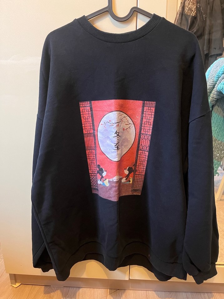 Siyah renkli, yuvarlak yaka ve uzun kollu kadın sweatshirtü, bol kesim ve normal boyda. Yumuşak ve sıcak kumaş üzerine baskılı tasarıma sahip, günlük sokak stili için uygun.