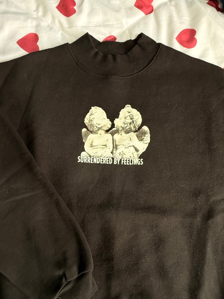 Siyah, baskılı, uzun kollu ve bisiklet yaka kadın sweatshirtü, yumuşak ve sıcak kumaştan yapılmıştır. Göğsünde iki melek figürü ve 'SURRENDERED BY FEELINGS' yazısı bulunur.