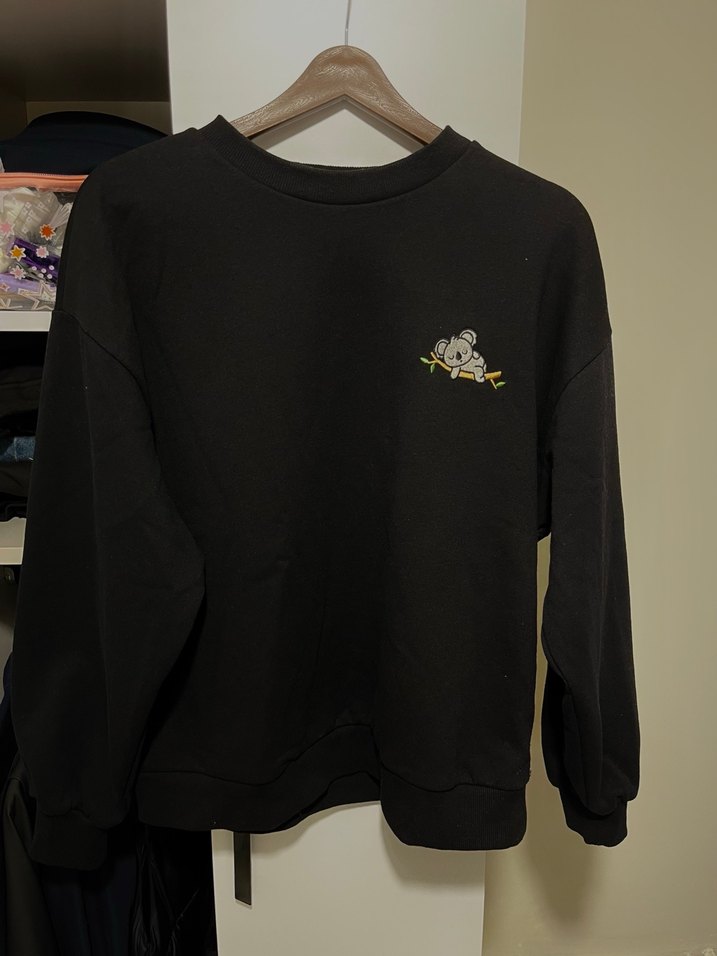 Uzun kollu, bisiklet yaka ve bol kesim siyah sweatshirt. Yumuşak, örgü görünümlü kumaştan üretilmiş, göğüs kısmında küçük baskılı koala deseni bulunur. Günlük rahat kullanıma uygundur.