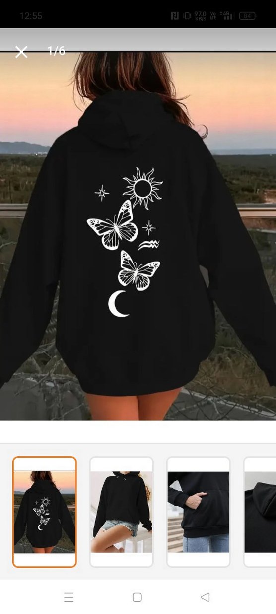 Siyah, uzun kollu, bol kesim kadın sweatshirtü. Arkasında beyaz güneş, ay ve kelebek baskıları bulunur. Yumuşak sentetik kumaştan, yuvarlak yakalı ve drapeli.