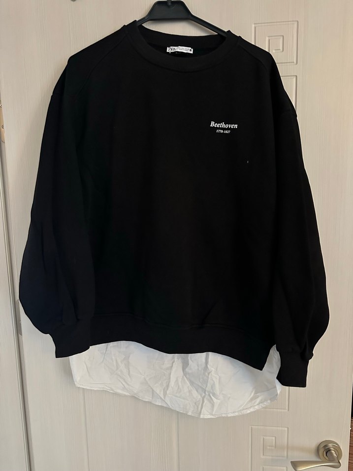 Uzun kollu, bisiklet yaka ve bol kesim siyah sweatshirt, baskılı detay ve katmanlı etek ucu ile rahat sokak stili sunar.