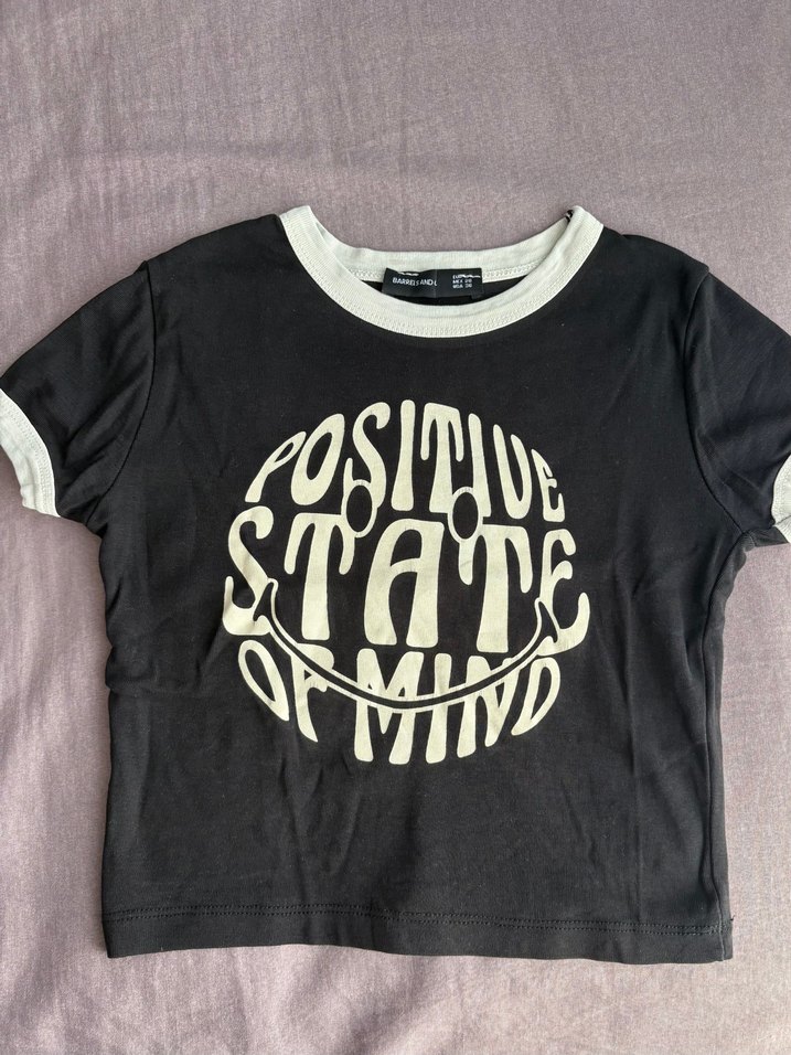 Kısa kollu, yuvarlak yaka, siyah baskılı kadın tişörtü. Yumuşak sentetik kumaştan,trend görünümlü. Hiç giyilmedi