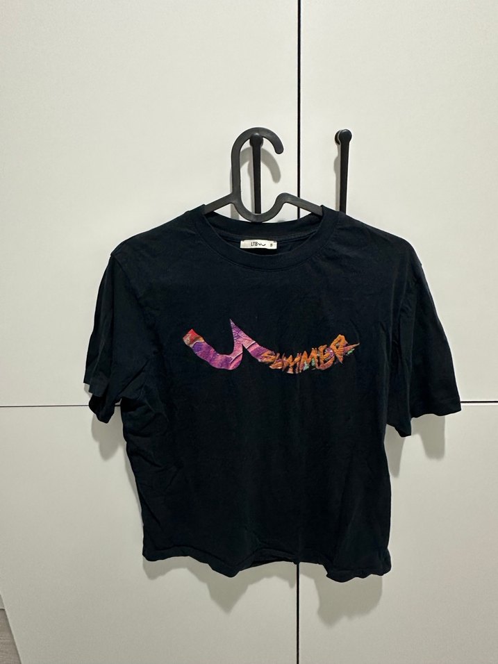 Siyah, kısa kollu, yuvarlak yaka, bol kesim kadın tişörtü. Ön kısmında renkli baskı deseni bulunur, yumuşak tekstil kumaştan üretilmiştir.