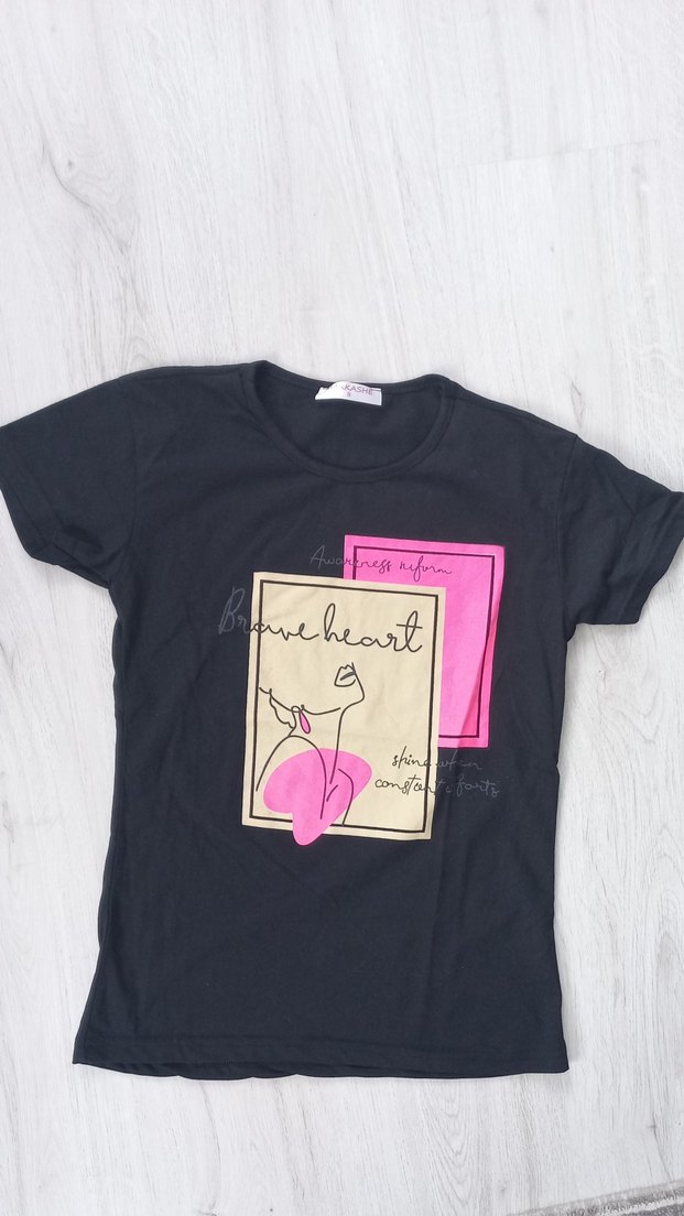 Siyah, pamuklu kısa kollu, bol kesim tişört. Önünde pastel pembe ve bej renkli baskılı grafik bulunur. Yuvarlak yaka, rahat sokak stili için uygun.